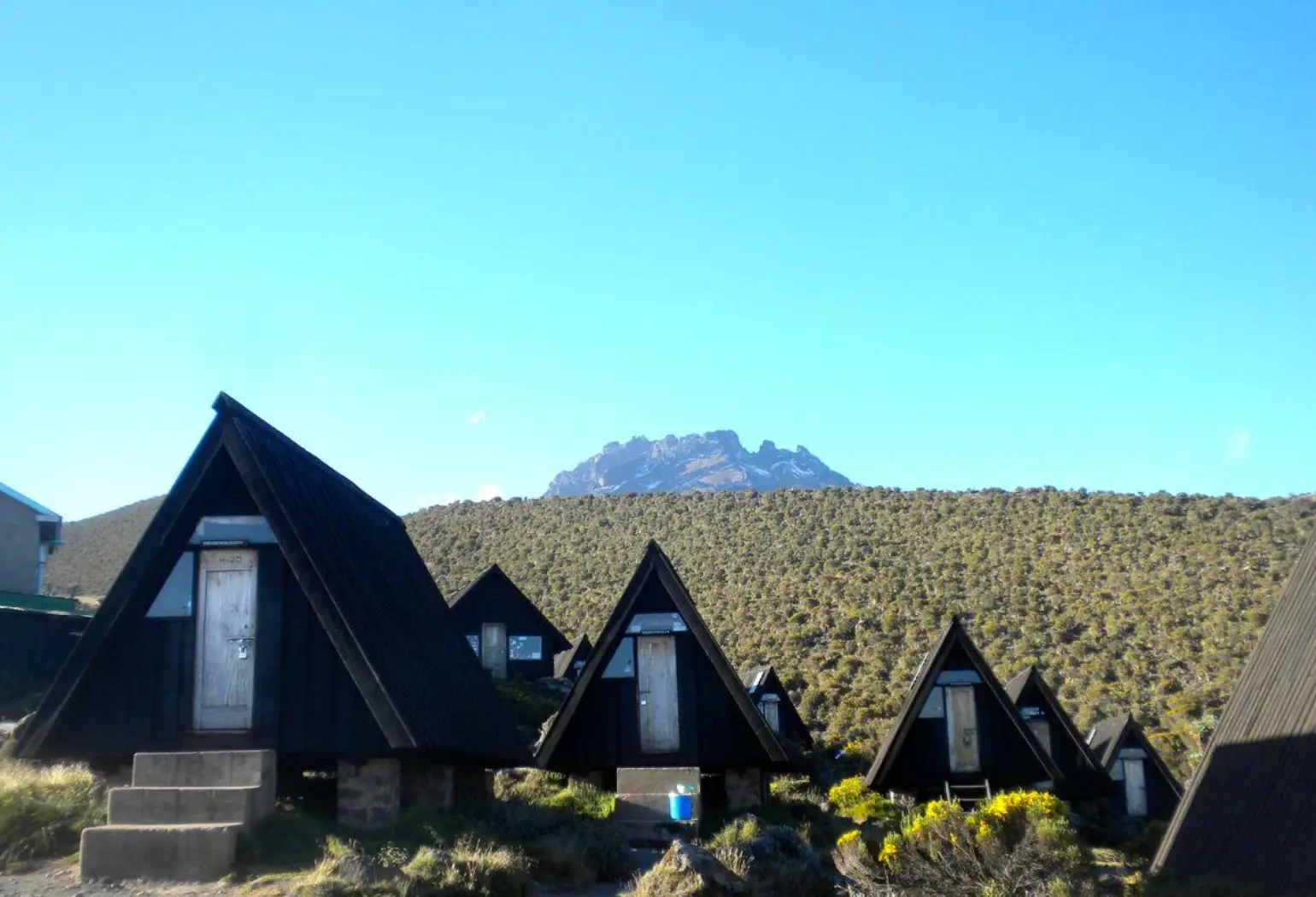 Your first night stop, Mandara hut, consisting of a group of wooden A-framed huts in a forest clearing. Each hut features 6-8 sleeping bunks with solar generated lighting. The total capacity of the camp is 60 climbers. Water is piped into the camp from springs above and there are flush toilets behind the main hut. Dinner is prepared by our cook and served in a communal dining mess.