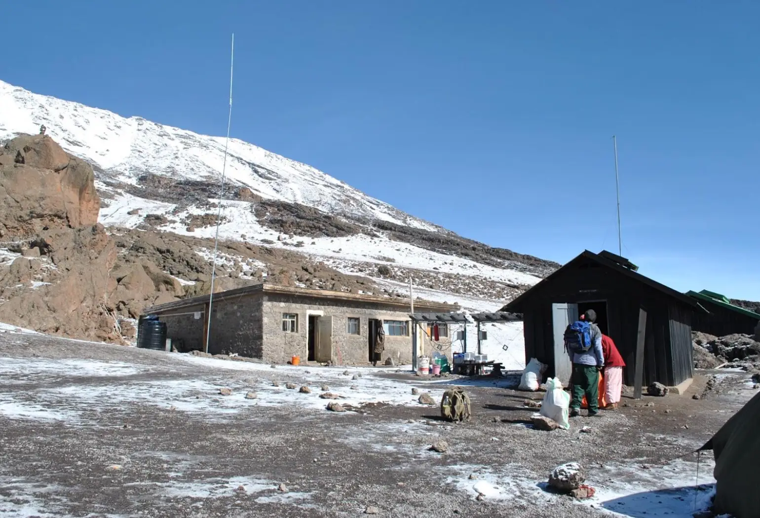Situated in the barren Alpine desert is Kibo hut, a stone build block house which has bunk beds for 60 climbers, but no streams with water nearby. It is however possible to buy mineral water and soft drinks at the camp office. There are platform toilets behind the hut.